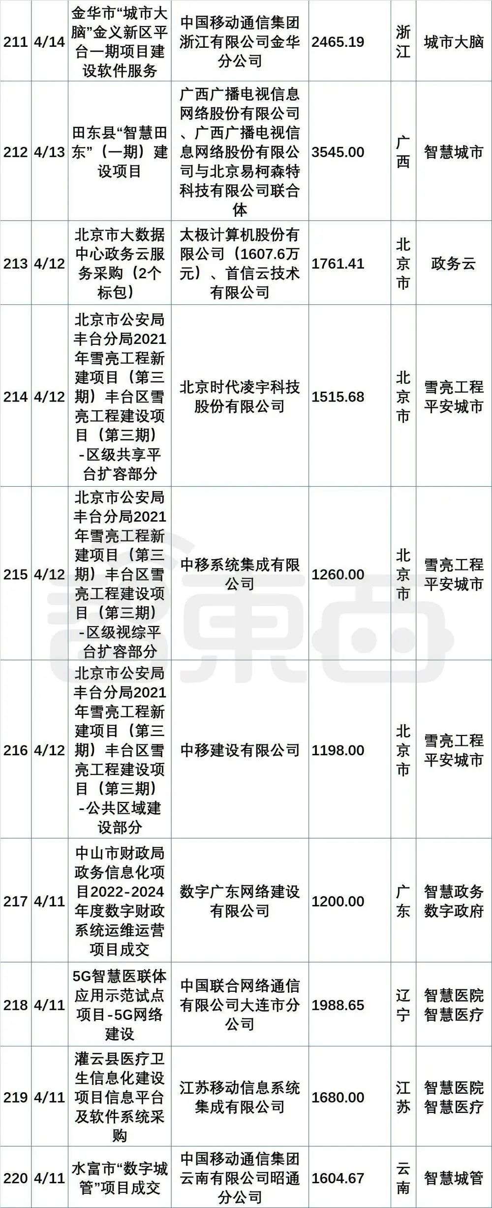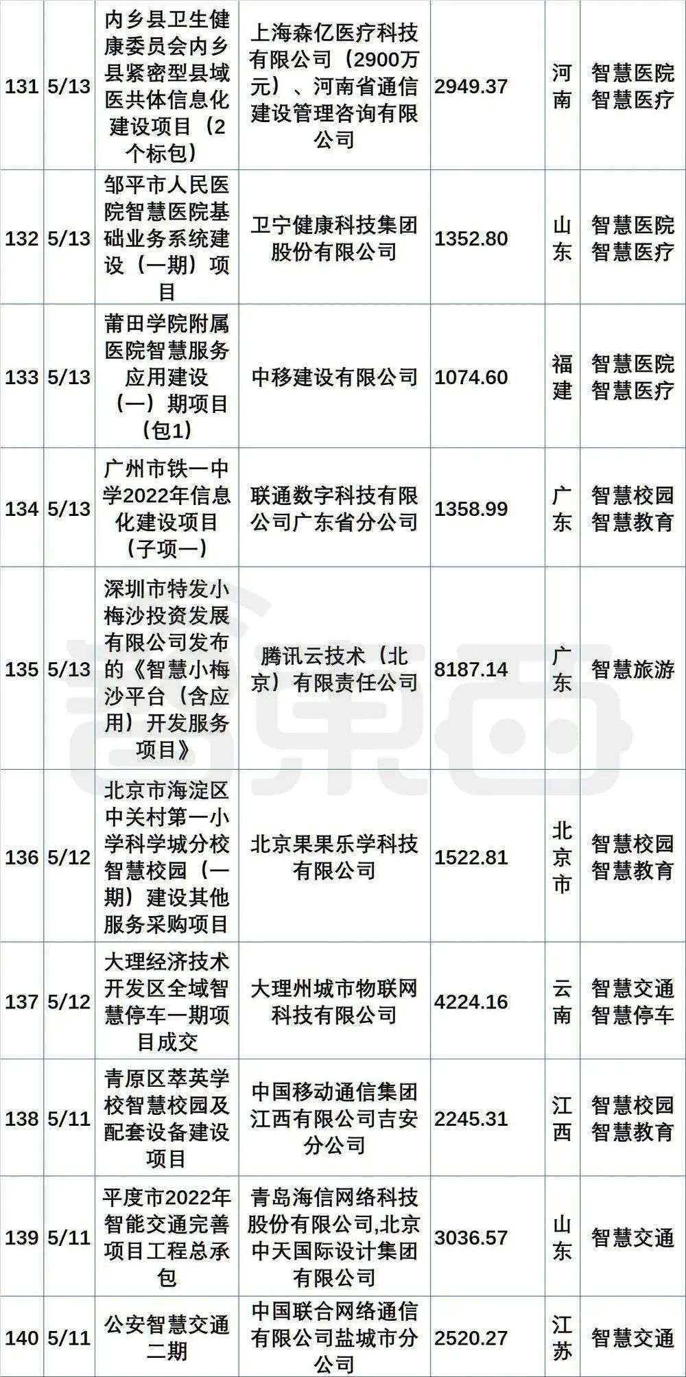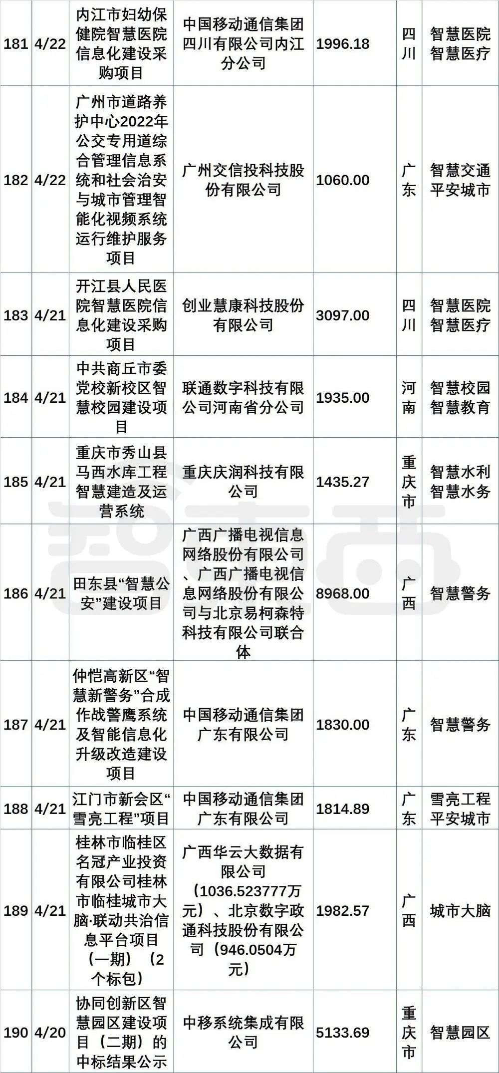 但从第一季度和第二季度的数百个千万级智慧城市项目的大单中,我们不难发现其实各地推进数智化转型的步伐还是相当迅速的,很多项目从招标到公布中标人选只用了一个多月的时间。其实,这与各地推进智慧城市、数字政府等数智化转型建设密切相关,不少单位可能会利用云平台等方式线上进行项目开标评选,降低疫情影响,进一步推动城市智慧化建设、政务数字化建设。