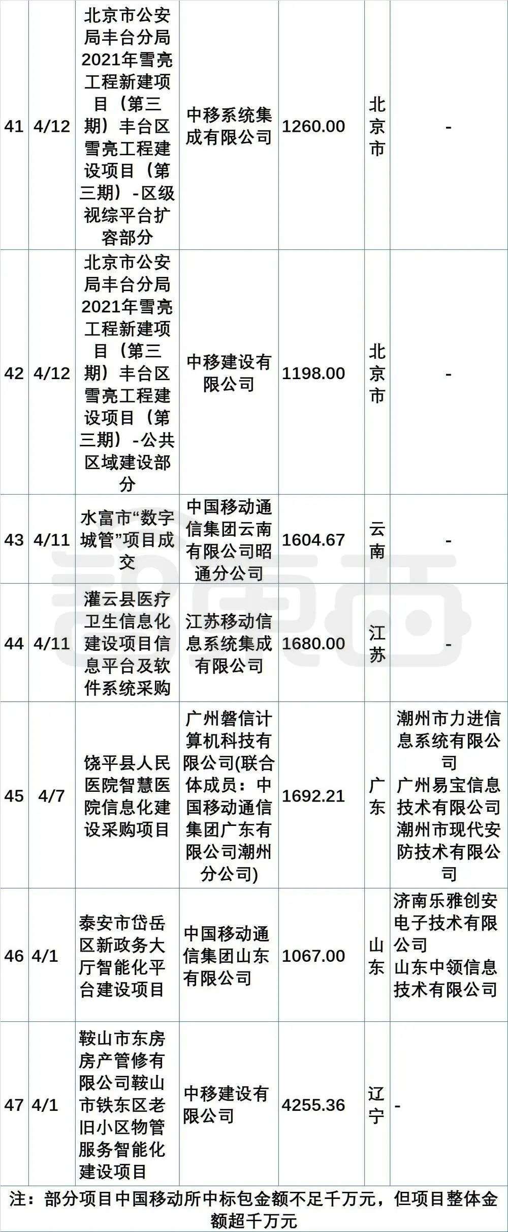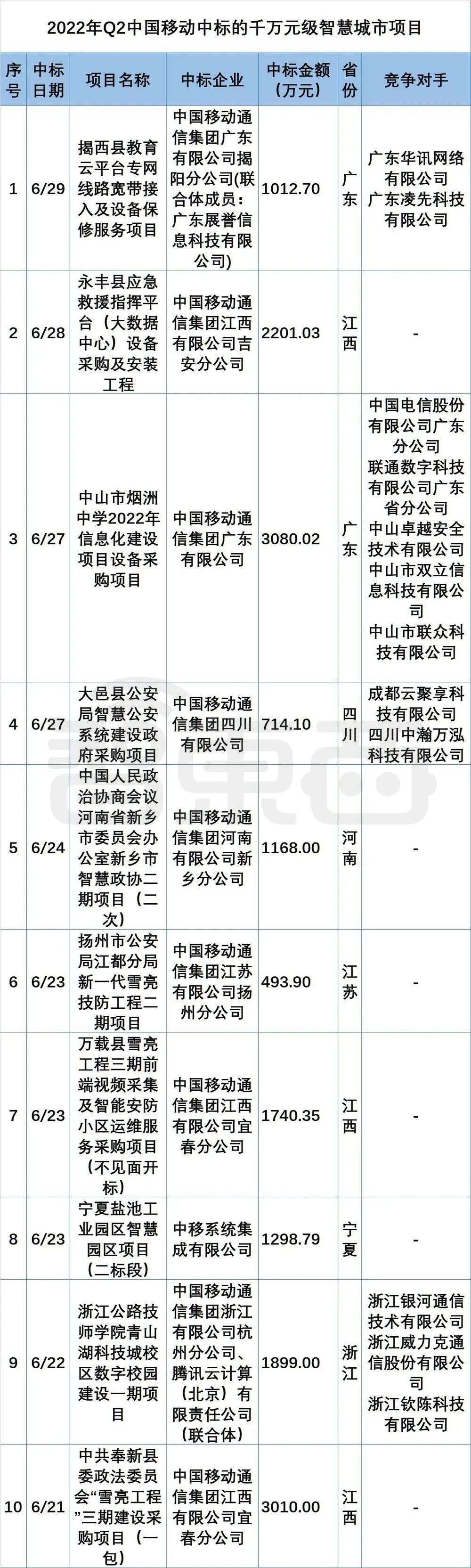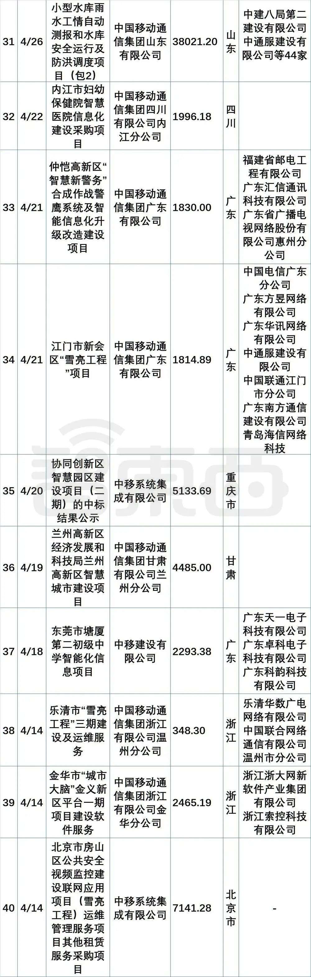 中国移动中标的智慧城市项目为47个,主要由中国移动各省或各市分公司、中移系统集成、中移建设、浙江移动信息系统集成有限公司、江苏移动信息系统集成有限公司拿下。