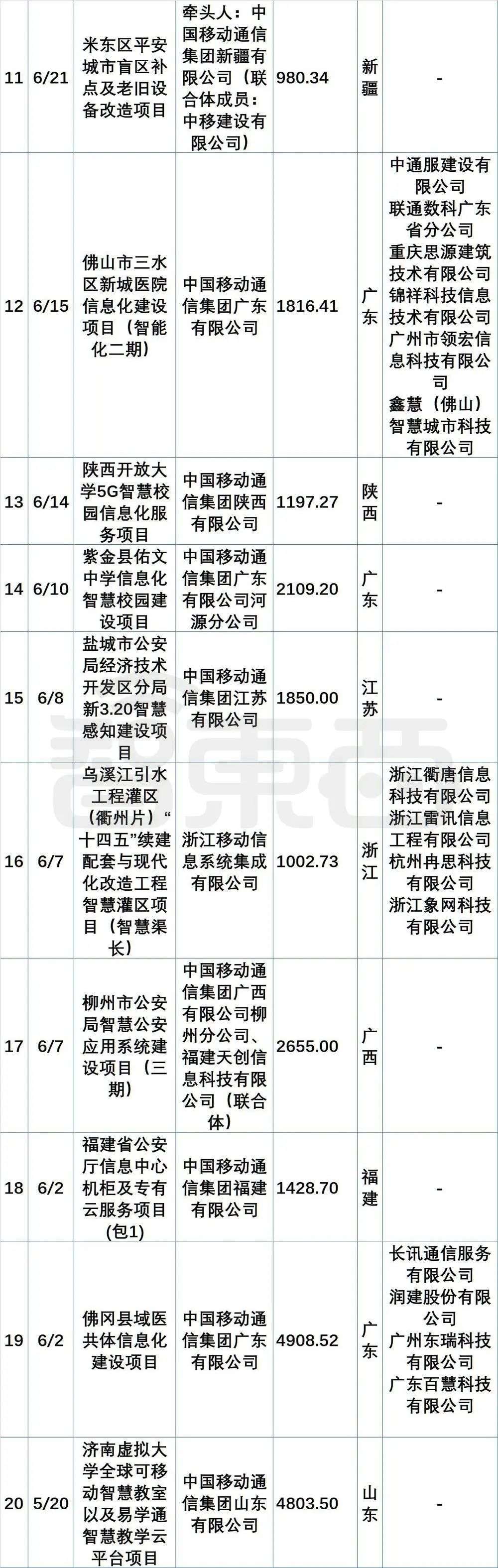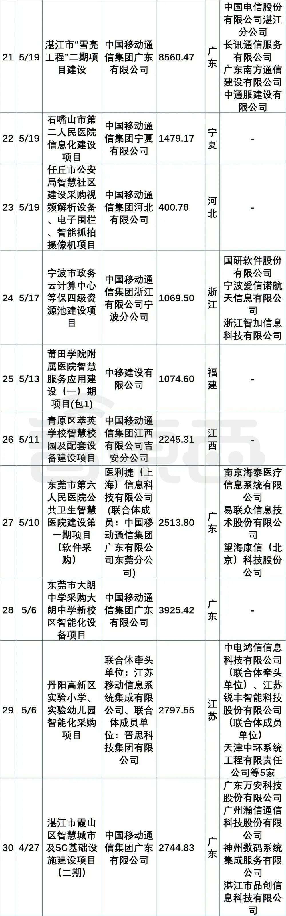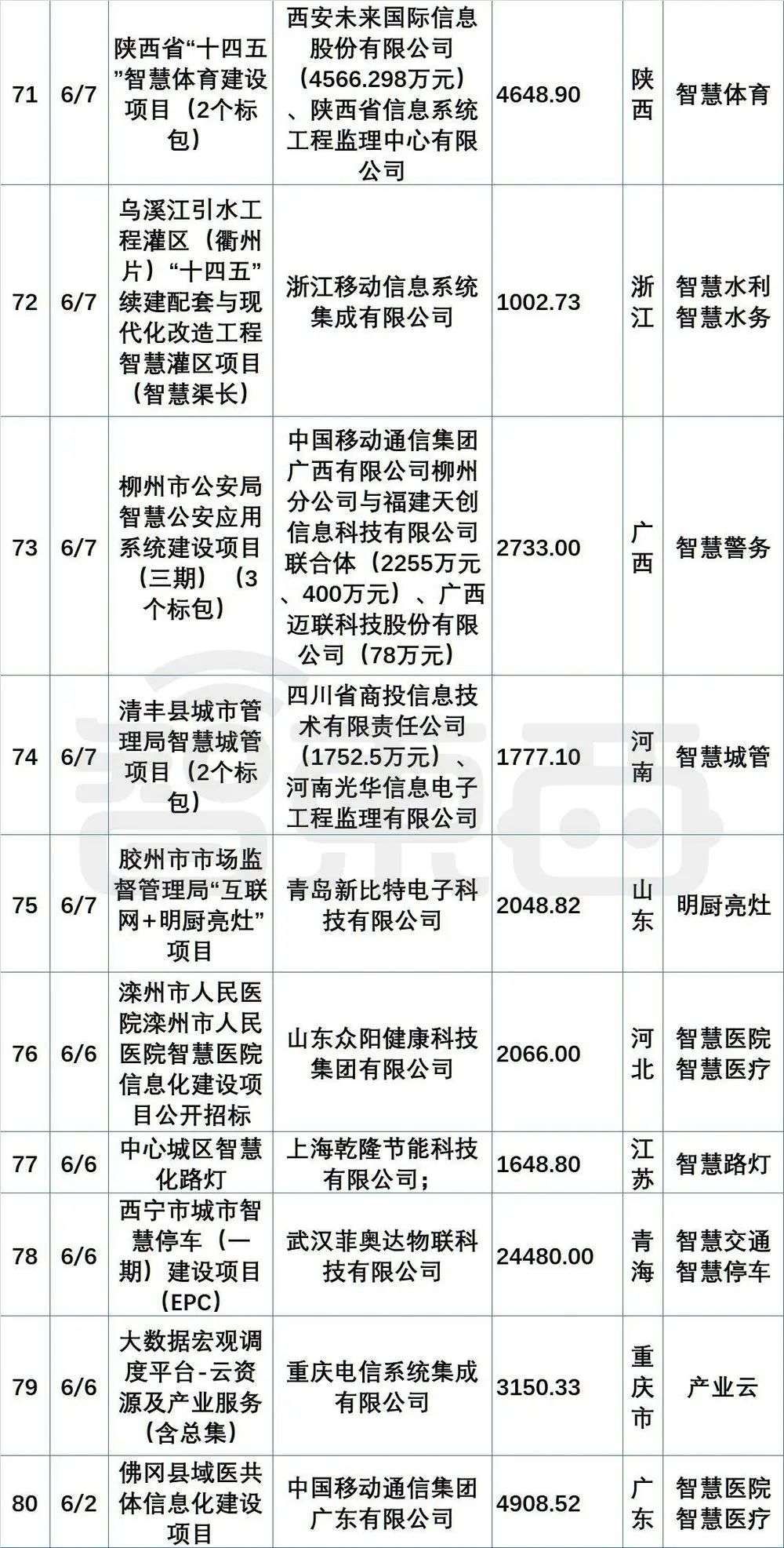 中国移动中标的智慧城市项目为47个,主要由中国移动各省或各市分公司、中移系统集成、中移建设、浙江移动信息系统集成有限公司、江苏移动信息系统集成有限公司拿下。