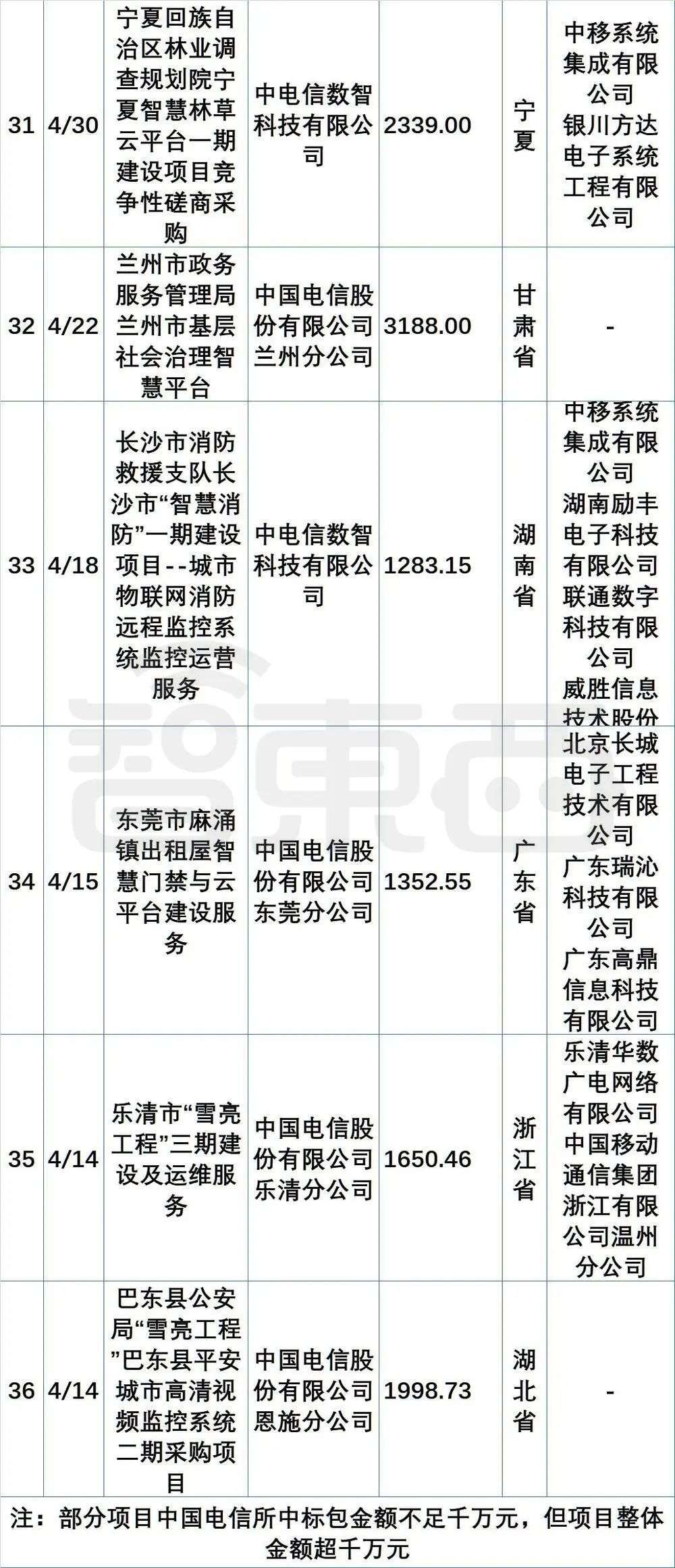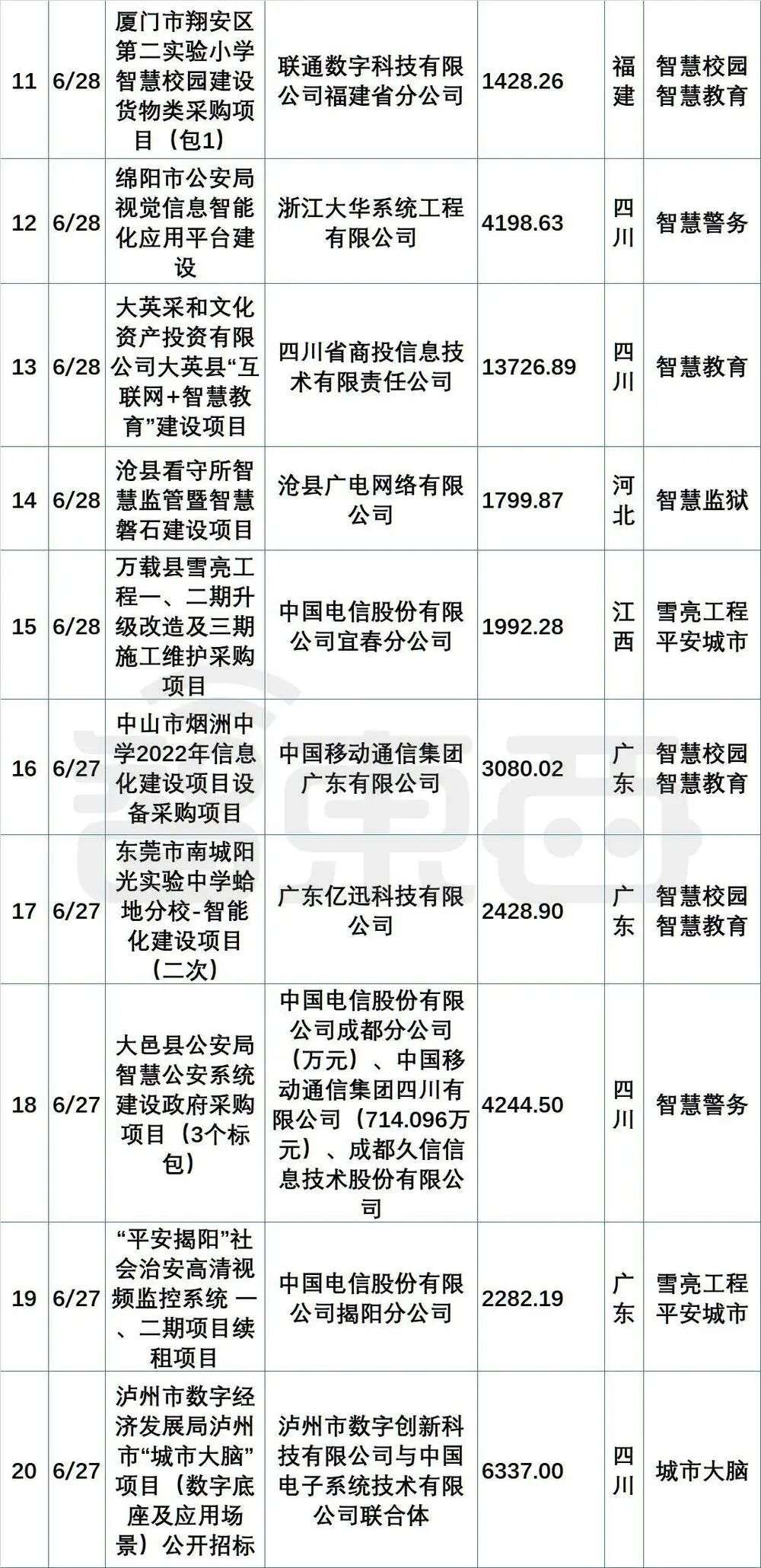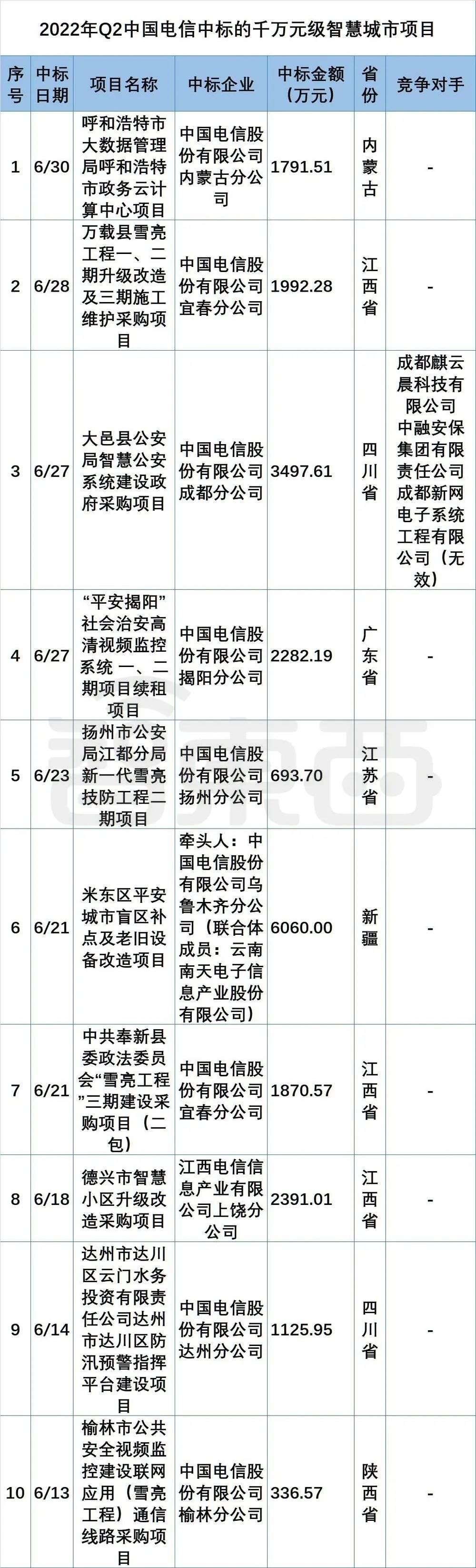 智慧安防赛道中单个项目中标金额最高的是中国电信和安徽广电网络、四创电子联合体,该联合体以1.76亿元的报价拿下了颍上县雪亮工程建设项目。