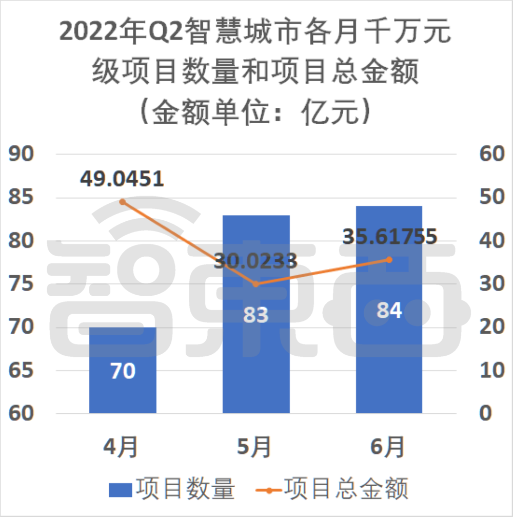 从金额来看,4月智慧城市项目的中标总金额最高,为49亿元,主要是因为有一个中标金额超26亿元的山东小型水库雨水工情自动测报和水库安全运行及防洪调度项目。5月的智慧城市项目中标总金额为30亿元,6月的智慧城市项目中标总金额为35.62亿元。其实如果按亿元级智慧城市项目数量来算,6月份公布中标结果的亿元级智慧城市项目数量最多,有7个。