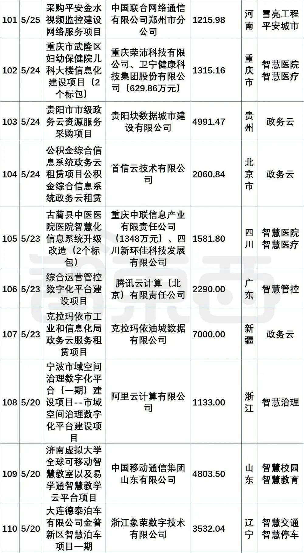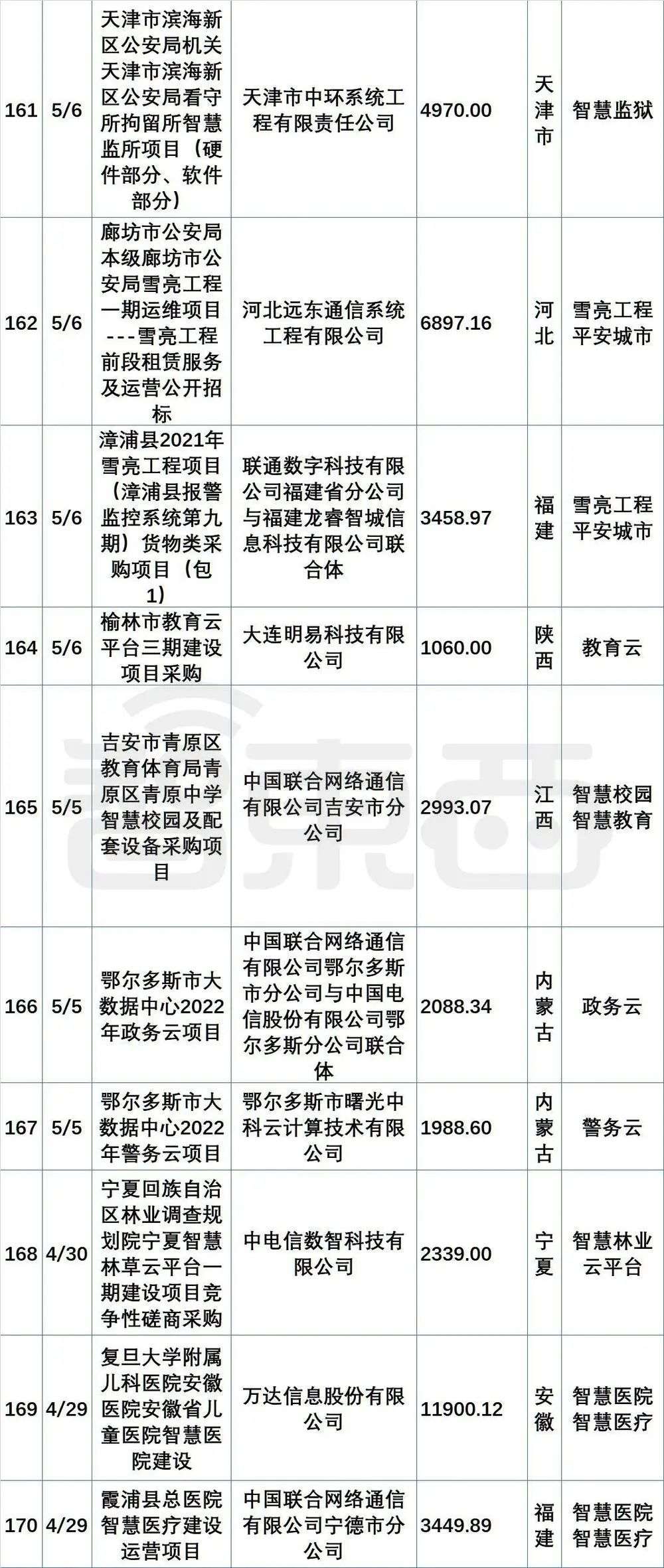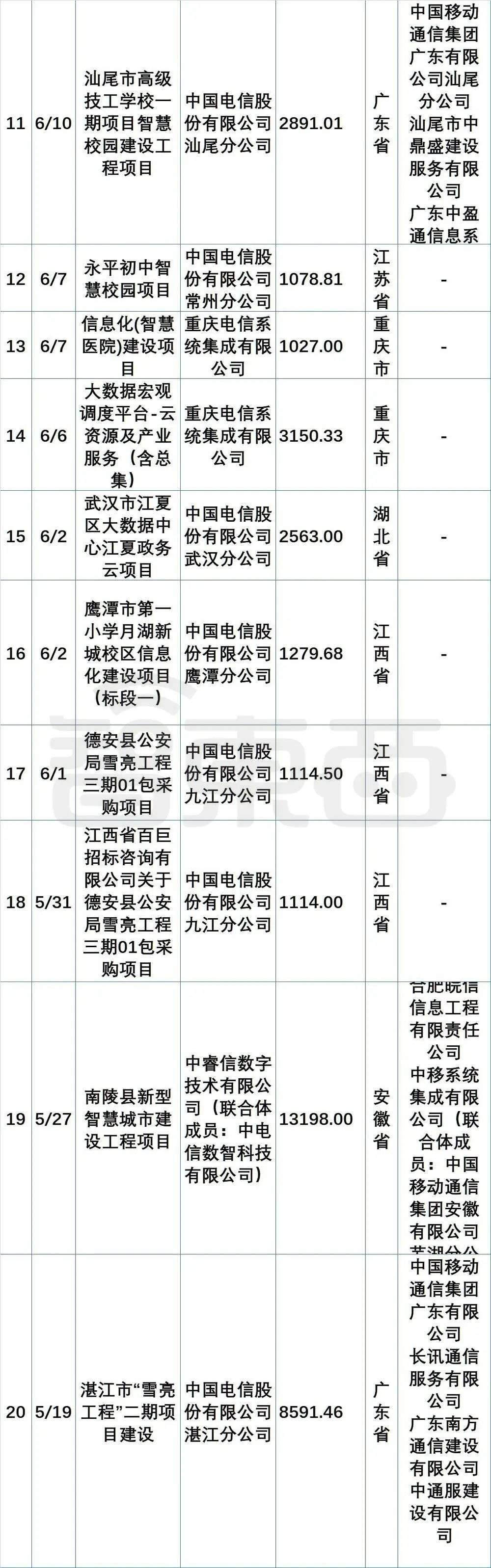 从中标企业的出现频率来看,三大运营商还是牢牢占据前三的位置,腾讯云、阿里云、华为等云计算头部玩家也拿下了多个项目。