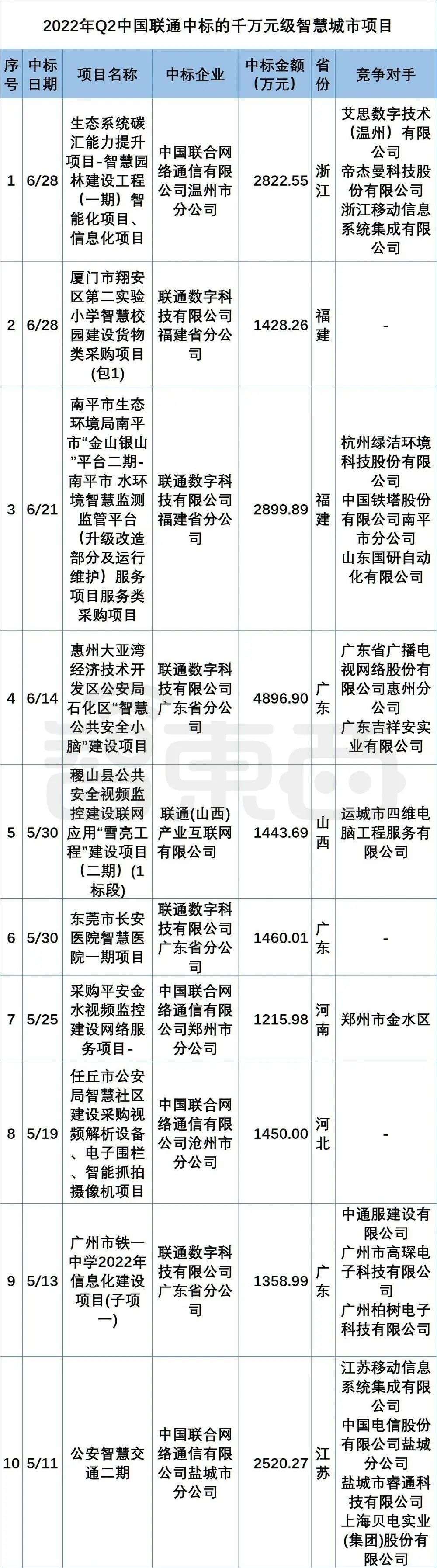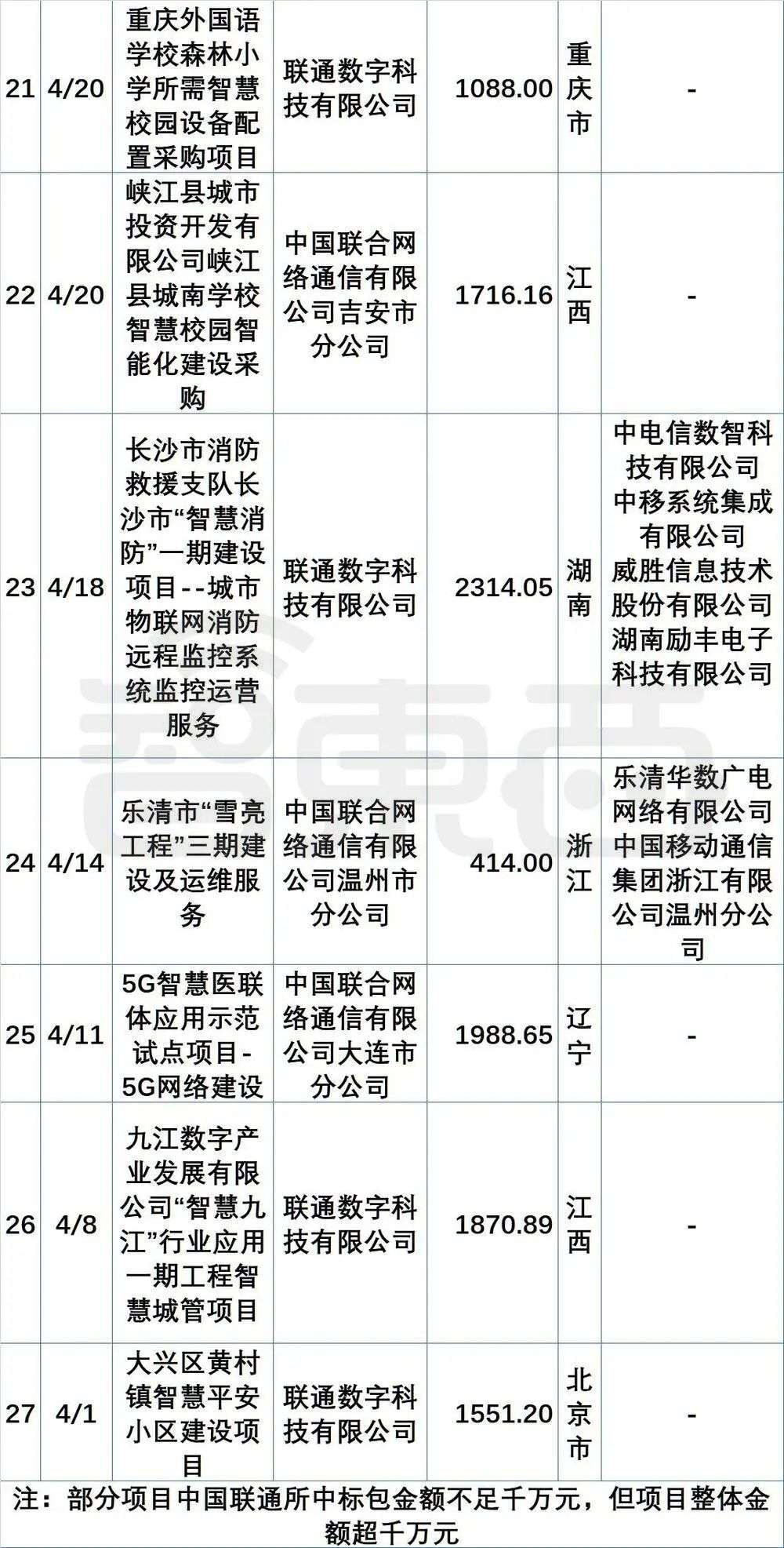 中国联通中标的智慧城市项目有27个,主要由中国联通各省或各市分公司、中国联通旗下的联通数字科技有限公司各分公司拿下。