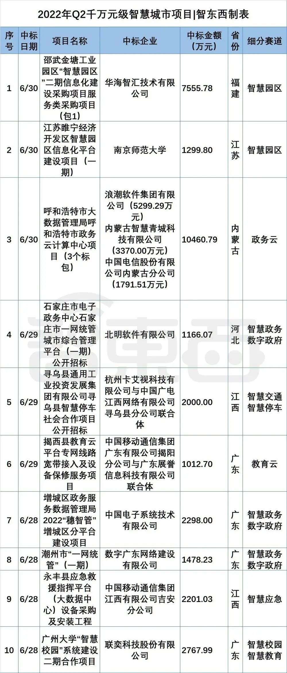 虽然中标企业的具体情况与2022年第一季度存在一定差异,但2022年上半年的两个季度,国内智慧城市中标项目均是以智慧化项目为主,存在少量政务云、云平台项目。