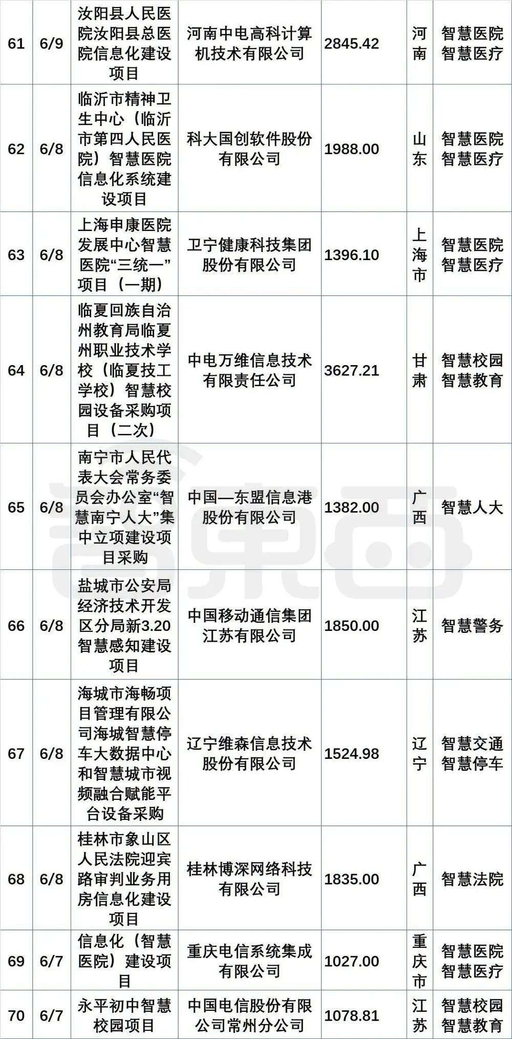 从项目数量来看,5月和6月,公布结果的智慧城市项目数量接近,分布为81个和84个,4月份,发布中标人选的智慧城市项目数量稍微少一些,为68个。