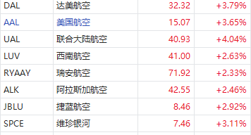 板块方面,美国航空股盘初上扬,联合大陆航空涨超4%,美国航空、达美航空涨超3%,波音涨超3%。