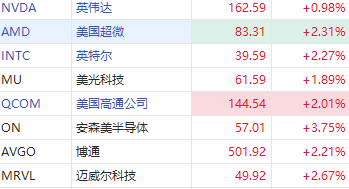 半导体板块走高,纳微半导体$NVTS 涨近4%,安森美半导体$ON 涨超3%,美国高通公司 $QCOM 、迈威尔科技 $MRVL 、英特尔 $INTC 涨超2%,美国超微 $AMD 涨近2%。消息面上,半导体业内人士透露,英特尔、Marvell与高通准备实行涨价来应对市况。英特尔传10月2日将逆势调整全产品线报价;Marvell传8月1日调涨7~8%;高通传调涨4%。
