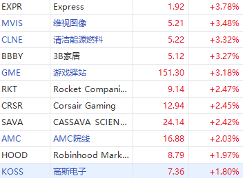 部分WSB概念股走高,Express$EXPR 、游戏驿站 $GME 、3B家居涨超3%,AMC院线 $AMC 涨超2%,高斯电子$KOSS 、Robinhood $HOOD 涨近2%。