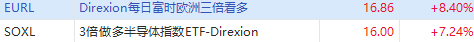 ETF方面,每日富时欧洲三倍看多 $EURL 涨超8%,3倍做多半导体指数ETF $SOXL 涨超7%。