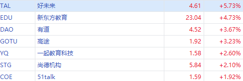 中概教育股延续涨势,好未来大涨超5%,新东方教育涨超4%,有道、高途涨超3%。
