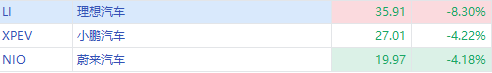 中概新能源车股走跌,理想汽车跌超8%,蔚来汽车、小鹏汽车跌超4%。