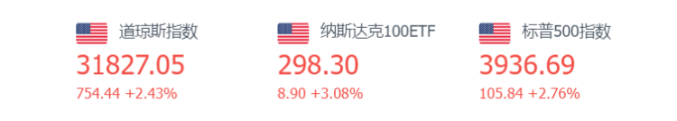 美股周二大涨,道指涨754.44点,涨幅为2.43%,报31827.05点;纳指涨353.10点,涨幅为3.11%,报11713.15点;标普500指数涨105.84点,涨幅为2.76%,报3936.69点。特斯拉收高2.07%,英伟达收高5.53%,阿里收高1.56%。