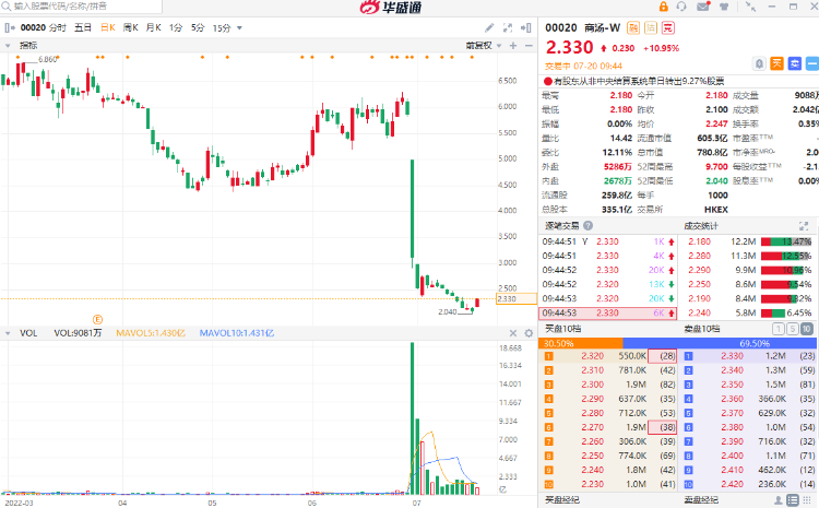 华盛资讯7月20日消息,商汤反弹回升,回归5日均线,最新报2.33港元每股,涨10.95%,成交额2.04亿港元。
