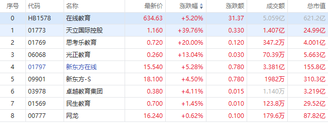 华盛资讯7月20日消息,港股在线教育股集体上涨,天立国际控股涨39.76%,思考乐教育涨超20%,新东方在线涨5.28%,报15.54港元每股;新东方涨超4%,卓越教育、民生教育跟涨。