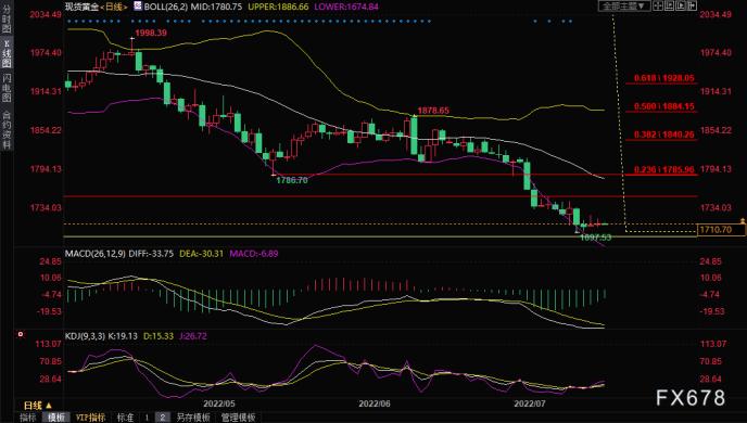 考虑到周四欧洲央行将加息25点或50点,金价短线进一步下探的风险也明显增加;技术面来看,金价可能会试探去年8月份低点1690附近支撑。