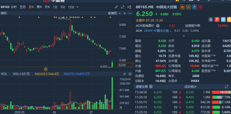 但光大控股股价走势现况明显低机构预期,截至发稿时,光大控股大跌9.55%创下年度新低,报6.25港元。
