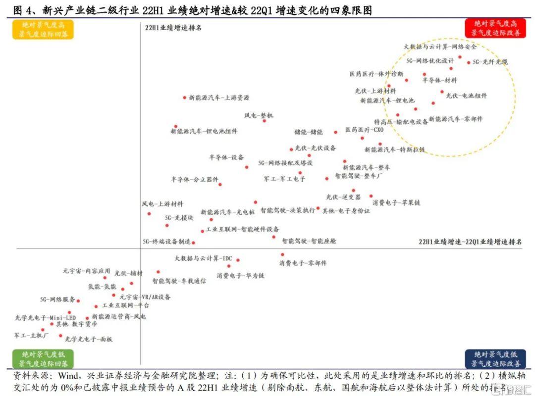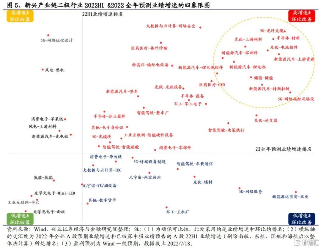我们绘制了各行业22H1业绩绝对增速、22H1增速-22Q1增速二维框架图,纵轴代表行业各行业22H1业绩增速排名,横轴是为各行业业绩变动幅度排名,横纵轴交汇点为0%和已披露中报业绩预告的A股22H1业绩增速(剔除南航、东航、国航和海航后以整体法计算)的排名,作为四象限划分的基准。从行业分布来看,今年上半年(二季度)业绩增速和较一季度的业绩增速的变化具有较强的正相关性。具体到行业上,5G(光纤光缆、网络优化设计)、新能源汽车(锂电池、零部件、特斯拉链、整车)、光伏(电池组件、上游材料)、医药医疗(体外诊断)、大数据与云计算(网络安全)、半导体(材料)和特高压(输配电设备)等行业景气度绝对水平较高且边际改善幅度显著。