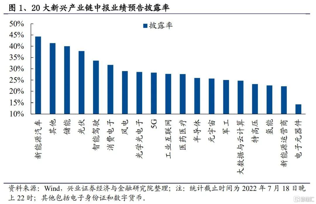 按照兴证策略团队独家构建的20大新兴产业链划分,三成个股披露2022年上半年业绩预告。截至2022年7月18日晚上22时,20大新兴产业链中有491家企业发布了2022年中报业绩预告,披露率为30.29%。由于新兴产业链中的成分股所属创业板和科创板比例较高,故整体披露率低于全部A股。其中,新能源汽车、储能、光伏和智能驾驶等产业链的披露率较高。