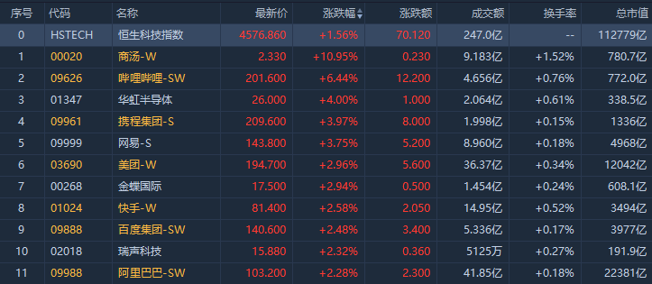 恒生科技指数涨1.56%,商汤大涨逾10%,哔哩哔哩涨6%,华虹半导体、携程集团涨4%,网易涨近4%,美团涨近3%。