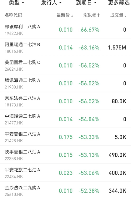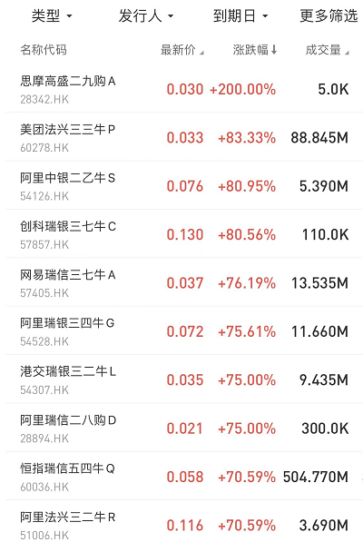 在今日涨幅榜中,思摩高盛二九购A $28342.HK 涨200.00%;美团法兴三三牛P $60278.HK 涨83.33%;阿里中银二乙牛S $54126.HK 涨80.95%。