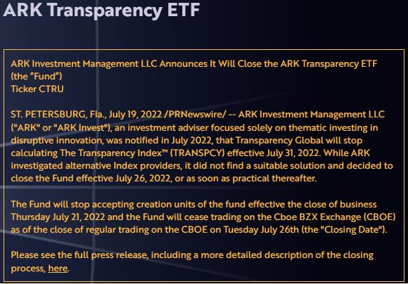 据监管申报文件,“木头姐”凯西·伍德旗下方舟投资管理公司正在关闭去年年底推出的ARK透明度ETF。据悉,该ETF的持仓包括Teladoc Health和Spotify等,目标是投资于透明度得分高的公司。该ETF自问世至今已累计下跌了近36%。根据该公司的声明,方舟透明度基金在周四之后将不再接受认购,并将在7月26日之后停止在CBOE BZX交易所的交易。