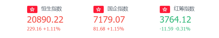 截至周三收盘,恒生指数涨1.11%,报20890.22点;国企指数涨1.15%;恒生科技指数涨1.56%,商汤大涨逾10%,哔哩哔哩涨6%,华虹半导体、携程集团涨4%,网易涨近4%,美团涨近3%。