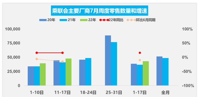 乘联会:7月11-17日乘用车零售同比增长16%至33.5万辆 批发同比增长35%至36.0万辆
