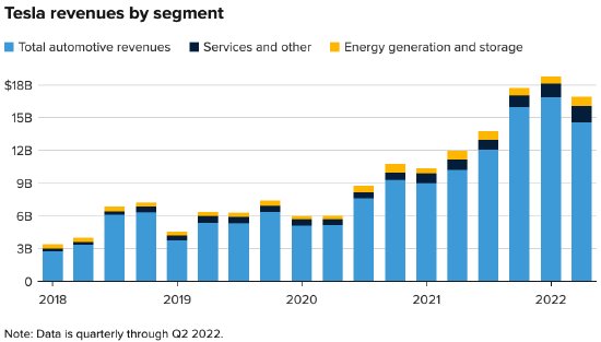 二季调整后度每股收益2.27美元,市场预期1.81美元;营收同比增长41.6%至169亿美元,一季度为188亿美元;净利润22.59亿美元,市场预期19.84亿美元,一季度为32.80亿美元。公司表示,受通胀和电动汽车电池和其他组件竞争加剧的影响,二季度汽车毛利率为27.9%,低于一季度的32.9%和上年同期的28.4%。二季度总营收中,汽车营收为146亿美元,14.7亿美元来自服务和其他收入。
