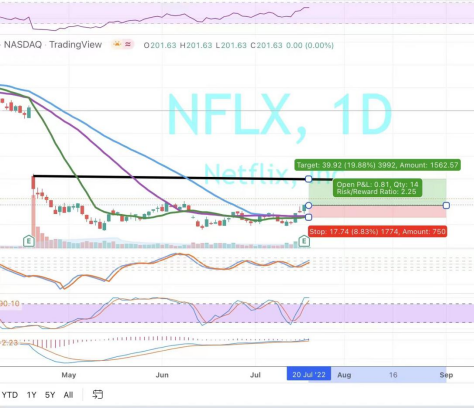 奈飞这只股票是财报后交易日的一个很好的例子,对于奈飞这样的股票,是非常快速响应财报的,前两轮的财报发布,每次跌下很大一截,形成了gap。现在使用财报后策略,单从技术层面来看,向下跌到低点最多是8%,而向上涨,因为突破了所有阻力位,限制股价的则是上一次财报的前高,则可能涨20%左右,计算风险收益比,RR值是划得来的,所以近期是一个好的买点。