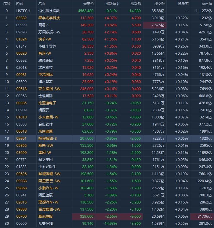 舜宇光学科技涨逾4%领涨成分股,科网股涨跌不一,网易涨近4%,万国数据涨超2%,快手涨1.35%;阿里巴巴、美团跌逾1%,腾讯跌2.66%,众安在线大跌超14%创今年3月以来新低。