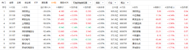 截至发稿,洛阳钼业A股涨停,H股现涨9.14%;中远海能A股涨4.34%,H股现涨3.03%;君实生物A股涨3.74%,H股现涨1.22%。