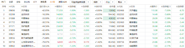 天齐锂业A股跌7.03%,H股跌1.90%;金风科技A股跌5.66%,H股跌3.03%;中国神华A股跌5.58%,H股跌5.26%。