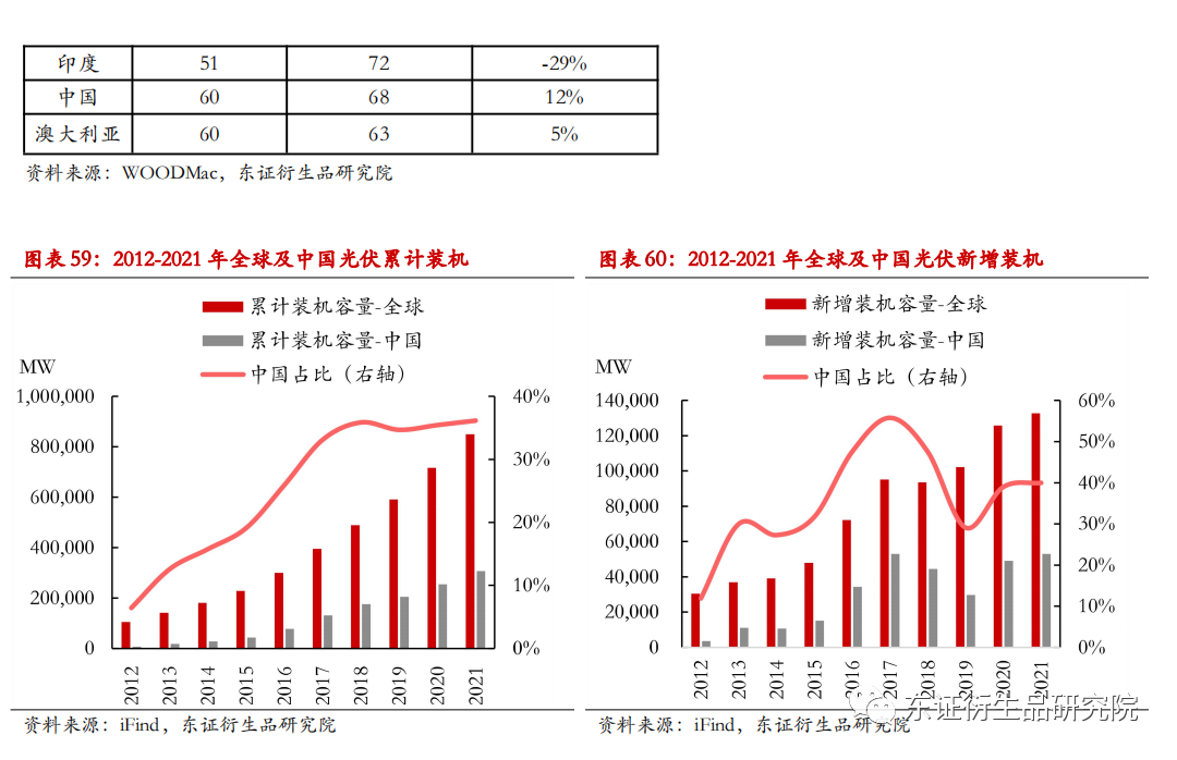 全球对环保目标下的净零排放已基本达成共识,叠加光伏项目经济性逐渐显露,各国积极探索发展可再生能源发电。近年来,世界各国纷纷做出实现碳减排的承诺,温室气体主要排放国大多制定了相应的可再生能源目标,可再生能源装机量空间巨大。IRENA基于1.5℃的温控目标,预测2030年全球可再生能源装机可达10.8TW。此外,据WOODMac数据,中国、印度、美国等国家太阳能发电的平准化度电成本(LCOE)已低于最便宜的化石能源,未来还将进一步下降。各国政策的积极推动以及光伏发电自身的经济性,导致近年来全球及中国光伏累计装机量的稳步增长。2012-2021年,全球光伏累计装机量从104.3GW上升至849.5GW,我国光伏累计装机量更是从6.7GW上升到307GW,实现了超44倍的增长。此外,我国每年新增光伏装机占到全球总新增装机的20%以上,2021年我国新增光伏装机53GW,占全球新增装机规模的40%左右。这主要得益于我国丰富均匀的光能资源分布、完善发达的上下游以及国家政策的大力支持,在此期间我国发挥出了光伏发电的巨大潜力,累计装机规模占比从不足6.5%跃升至36.14%。