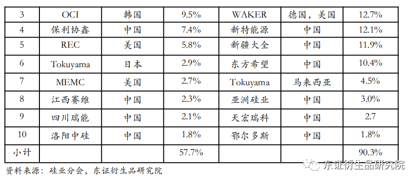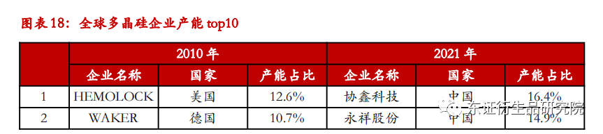 近年来,全球多晶硅产量逐年增加,且逐渐向我国聚集。2017-2021年,全球多晶硅年产量从43.2万吨一路上涨至63.1万吨,其中2021年增长最快,增速达21.11%。期间全球多晶硅生产逐渐向我国集中,我国多晶硅产量占比从2017年的56.02%上升到2021年的80.03%。对比2010年与2021年全球多晶硅产能前十名企业,可以发现其中中国企业数量由4家上升到了8家,部分美国、韩国企业产能占比大幅下降,掉出了前十名的队伍,比如HEMOLOCK、OCI、REC以及MEMC;产业集中度明显提升,行业前十名产能合计占比由57.7%上升至90.3%,2021年产能占比超过10%的中国企业有五家,分别是协鑫科技、永祥股份、新特能源、新疆大全和东方希望,合计占比达65.7%。多晶硅产业逐渐向我国转移的原因主要有三个,一是我国多晶硅生产企业在原材料、电力及人工成本方面具备显著优势,国内外工业硅价差较大,每吨价差可超万元,且国内电价、工人工资低于国外,因此国内整体生产成本远低于国外,且还将随着技术进步而不断下降;二是我国多晶硅产品质量不断提升,多数在太阳能级一级品水平,个别先进企业在纯度要求更高的电子级多晶硅生产技术方面取得突破,逐渐迎来国产电子级多晶硅对进口的替代,例如新特能源、特变电工、亚洲硅业正在积极推进电子级多晶硅项目建设;三是我国下游硅片制造环节产生大量多晶硅需求,2021 年国内硅片产量占全球总产量的比重高于95%,使得国内多晶硅自给率逐步提升,对海外多晶硅企业的市场造成一定挤压效果。