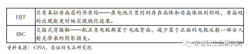 从电池技术路线看,电池技术的迭代更新主要历经了BSF、PERC,基于PERC改进而来的TOPCon,以及颠覆PERC的新技术HJT;TOPCon可与IBC进一步结合形成TBC,HJT也可与IBC结合成为HBC。p型单晶电池主要运用PERC技术,p型多晶电池包括多晶黑硅电池与铸锭单晶电池,后者是指在常规多晶铸锭工艺的基础上加入单晶籽晶,定向凝固后形成方型硅锭,并通过一系列加工工艺制成单晶与多晶混合的硅片,由于其本质上使用了多晶的制备路线,因此被列入p型多晶电池范畴。n型电池主要包括TOPCon单晶电池、HJT单晶电池及IBC单晶电池。2021 年,新建量产产线仍以 PERC 电池产线为主,PERC电池片市场占比进一步提升至 91.2%。随着国内外户用项目的产品需求纷纷集中于高效产品, 2021 年BSF电池市场占比由8.8%下降至 5%。