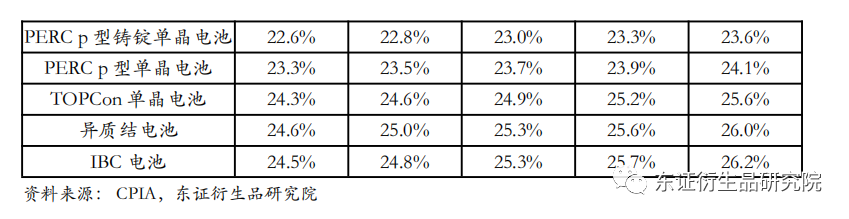 2021 年,n型电池转换效率提升明显,预计未来五年内技术进步空间较大。2021年,规模化生产的 p 型单晶电池均采用 PERC 技术,平均转换效率达到 23.1%,较 2020年提高 0.3 个百分点;采用 PERC 技术的多晶黑硅电池片转换效率达到 21.0%,较 2020 年提高0.2 个百分点;常规多晶黑硅电池效率提升动力不强,2021 年转换效率约 19.5%,仅提升 0.1 个百分点,未来效率提升空间有限;铸锭单晶 PERC 电池平均转换效率为 22.4%,较单晶 PERC 电池低 0.7 个百分点;n 型 TOPCon 电池平均转换效率达到 24%,异质结电池平均转换效率达到24.2%,两者较 2020 年均有较大提升,IBC 电池平均转换效率达到 24.1%,今后随着技术发展,TBC、HBC 等电池技术也可能会不断取得进步。未来随着在生产成本的降低及良率的提升,n 型电池将会是电池技术的主要发展方向之一。
