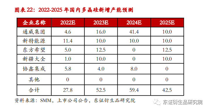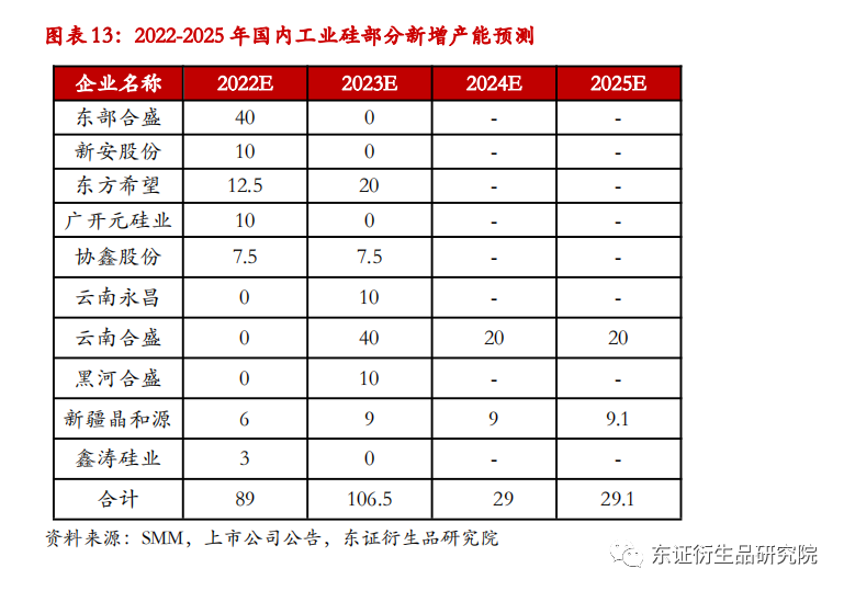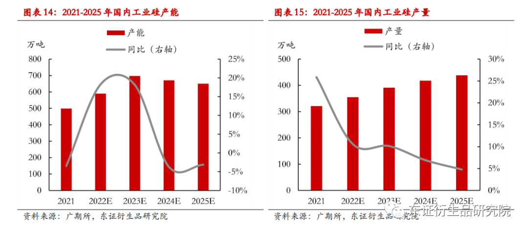 工业硅是多晶硅制备的核心原材料,预计2022-2025年国内工业硅产量稳步增长。2010-2021年,我国工业硅生产处于扩张阶段,产能及产量的年均增长率分别达到7.4%、8.6%。据SMM数据,2022、2023年国内工业硅新增产能89万吨、106.5万吨,其中合盛硅业仍占据近半壁江山,新增产能分别为40万吨、50万吨。假设未来工业硅企业仍保持60%左右的产能利用率及开工率,2022、2023年国内新增产能大约可带来32万吨、38.3万吨的产量增长。据广期所估计,22/23/24/25年国内工业硅产能约为590/697/671/650万吨,对应产量为355/391/418/438万吨。