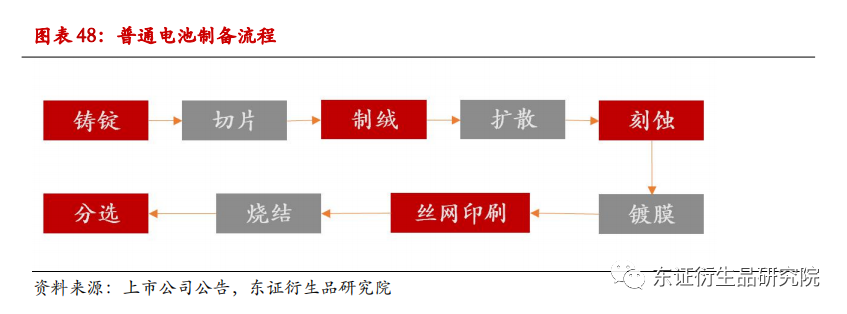 光伏产业链的中游环节包括光伏电池片、光伏电池组件,将硅片加工为电池片,是实现光电转换最为核心的步骤。由硅片加工成常规电池片大约需要七个步骤,首先将硅片放入氢氟酸中,使其表面产生金字塔状的绒面结构,从而降低太阳光的反射率,增加光吸收;二是在硅片一侧表面进行磷扩散,制成PN结,其好坏直接影响到电池片的效率;三是对扩散阶段在硅片侧表面形成的PN结进行清除,防止电池片短路;四是在形成PN结的一面镀一层氮化硅薄膜,减小光线反射,同时增加效率;五是在硅片正反面印刷金属电极,以收集光伏作用产生的少数载流子;六是将丝网印刷阶段印刷的电路烧结成型,与硅片成为一体,即为电池片;最后将不同效率的电池片归类。