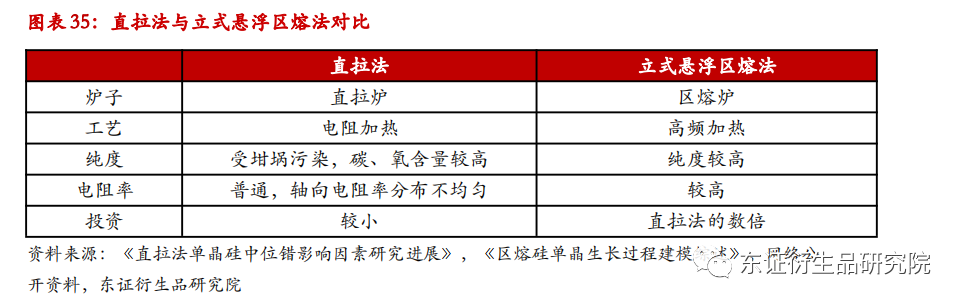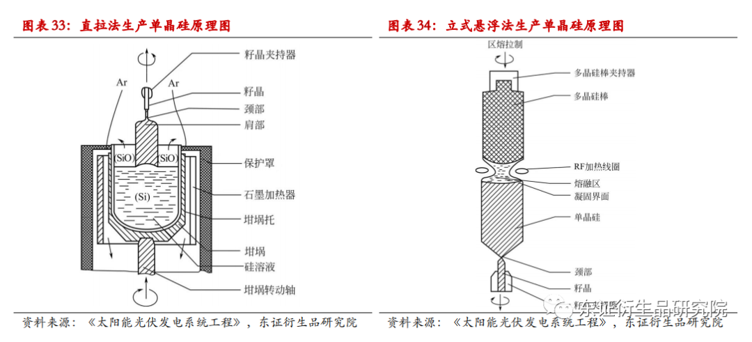 单晶硅棒的生产以直拉法为主,立式悬浮区熔法为辅,两者生产出的产品用途存在差异。直拉法是在一个直筒型的热系统中,用石墨电阻加热装在高纯度石英坩埚中的多晶硅以使其熔化,然后将籽晶插入熔体表面进行熔接,转动籽晶的同时反转坩埚,籽晶缓慢向上提升,经过引晶、放大、转肩、等径生长、收尾等过程,得到单晶硅。立式悬浮区熔法是指将柱状的高纯多晶材料固定于炉室中,将金属线圈沿多晶长度方向缓慢移动并通过柱状多晶,在金属线圈中通过高功率的射频电流,使得多晶柱线圈内部的部分熔化,线圈移过后,熔料再结晶生成单晶。由于生产工艺的不同,带来了生产设备、生产成本和产品质量等方面的差异。目前,区熔法制得的产品纯度较高,可用于半导体器件的制作,而直拉法能够满足制作光伏电池用单晶硅的条件,且具有较低的成本,因此是主流方法。2021年直拉法市占率约为85%,预计未来几年内会有小幅提升,2025年、2030年市占率预测值分别为87%、90%。区熔单晶硅方面,当前全球范围内区熔单晶硅的产业集中度较高,排名靠前的公司主要有Wacker Chemie(德国)、Shin-EtsuHandotai(日本)、Komatsu(日本,已被Sumco收购)、TOPSIL(丹麦),国内区熔单晶硅生产商有中环股份、京运通等,其中中环股份的国内市占率在65%以上,产量和市占率已连续5年居国内首位。未来区熔单晶硅的产量规模不会出现大幅上升,原因是国内相关技术较日本、德国较为落后,尤其是高频加热设备能力和成晶工艺条件,且行业内存在着技术封锁,因此生产大直径区熔硅单晶的技术需要国内企业自身继续摸索。