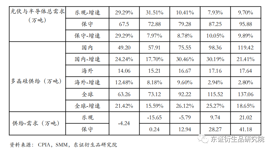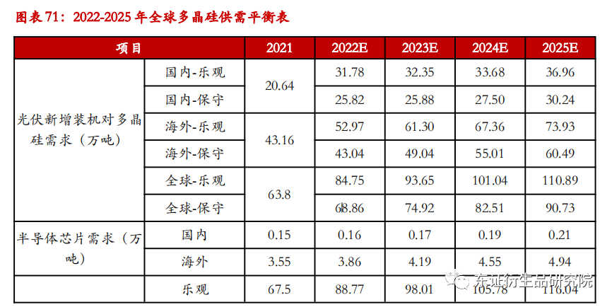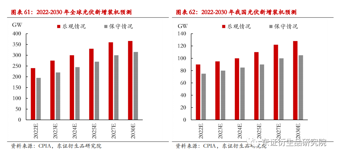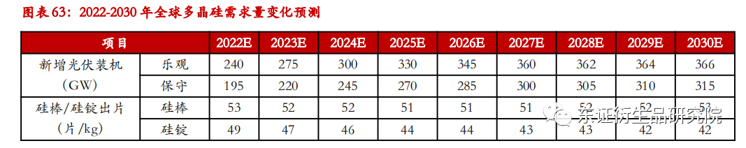 基于以上分析,CPIA给出了2022-2030年全球及国内光伏新增装机预测,预计在乐观和保守两种情况下,2030年全球新增装机规模分别为366、315GW,国内新增装机规模分别为128、105GW。下面我们将基于每年新增装机规模,对多晶硅需求量做出预测。