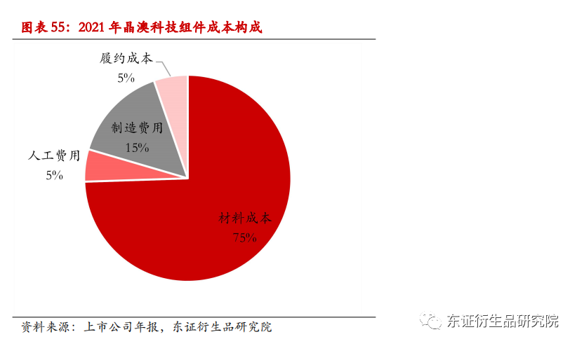 光伏组件生产步骤主要包括电池片互联和层压,电池片在组件总成本中占主要部分。由于单个电池片的电流和电压很小,因此需要将电池片通过汇流条互联起来,这里先把它们串联起来提高电压,再把它们并联起来取得高电流,然后将光伏玻璃、EVA或POE、电池片、EVA或POE、背板按照一定顺序密封热压,最后通过铝边框和硅胶密封边缘保护。从组件生产成本构成上看,材料成本占比为75%,占据主要地位,其次是制造费用、履约成本和人工费用。材料成本则以电池片成本为首,据多家企业公告可知,电池片在光伏组件总成本中占比约为2/3。