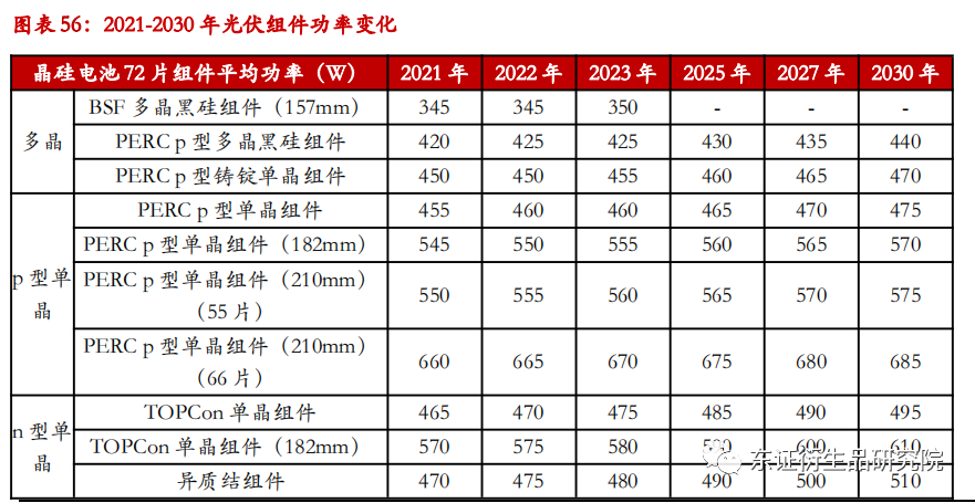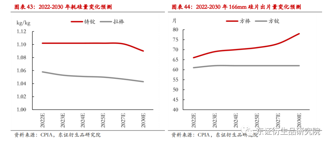 随着硅片厚度下降和金刚线母线直径减小,每公斤等径硅棒/硅锭的出片量将增加,且相同重量单晶硅棒的出片数高于多晶硅锭。功率上,各硅片的使用功率因种类和尺寸而异。2021 年, p 型166mm 尺寸每公斤单晶方棒出片量约为 64 片,多晶方锭出片量约为 59 片。p 型单晶硅片中,158.75mm 尺寸每公斤单晶方棒出片量约为 70 片,p 型 182mm 尺寸每公斤单晶方棒出片量约为 53 片,p 型 210mm 尺寸每公斤单晶方棒出片量约为 40 片。2022-2030年,硅片持续薄片化毫无疑问将带来同体积硅棒/硅锭出片数的增多,较小的金刚线母线直径和介质粒度也有助于降低切削损耗,从而增加出片量。预计2025及2030年,p 型166mm 尺寸每公斤单晶方棒出片量约为 71和78片,多晶方锭出片量约为 62 和62片,这是由于多晶硅片的低市占率难以引起技术大幅进步。不同类型及尺寸的硅片功率存在差别,据隆基绿能及中环股份公告数据,158.75mm尺寸硅片折算平均功率约为5.8W/片,166mm尺寸硅片平均功率约为6.25W/片,182mm尺寸硅片平均功率约为7.49W/片,210mm尺寸硅片平均功率约为10W/片。