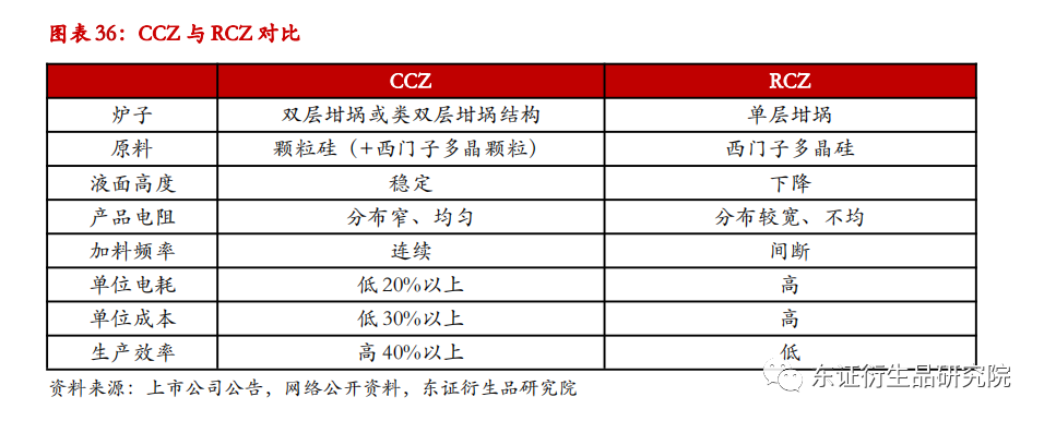 相较于改良西门子法,硅烷流化床法的优势有三个,一是电耗低,二是拉晶产出高,三是更有利于与较为先进的CCZ连续直拉技术相结合。据硅业分会数据,硅烷流化床法的综合电耗为改良西门子法的33.33%,还原电耗为改良西门子法的10%,硅烷流化床法具有显著的能耗优势。拉晶方面,颗粒硅的物理特性可令其更容易充分填充单晶硅拉棒环节的石英坩埚,根据REC的测试结果,相比100%的块状多晶硅,50%/50%混合法块状多晶硅和颗粒硅可增加单炉坩埚装料量29%,同时减少41%的装料时间,显著提高单晶硅的拉制效率。此外,颗粒硅的直径小且流动性好,更适合搭配CCZ连续直拉法。目前中下游单晶拉制环节的主要技术为 RCZ单晶复投法,是一根单晶硅棒拉制完成后再复投加料拉晶, 而 CCZ连续直拉法能够实现加料熔化与晶棒拉制同时进行,省去了单晶硅棒冷却的时间,因此生产效率较高。CCZ连续直拉法的快速发展,也将带动对颗粒硅的需求上涨。虽然颗粒硅具有某些缺点,比如摩擦产生的硅粉较多、表面积大易吸附污染物、熔化时氢结合为氢气易引起跳料,但根据相关颗粒硅企业最新公告,这些问题正在改进中且已取得一定进展。