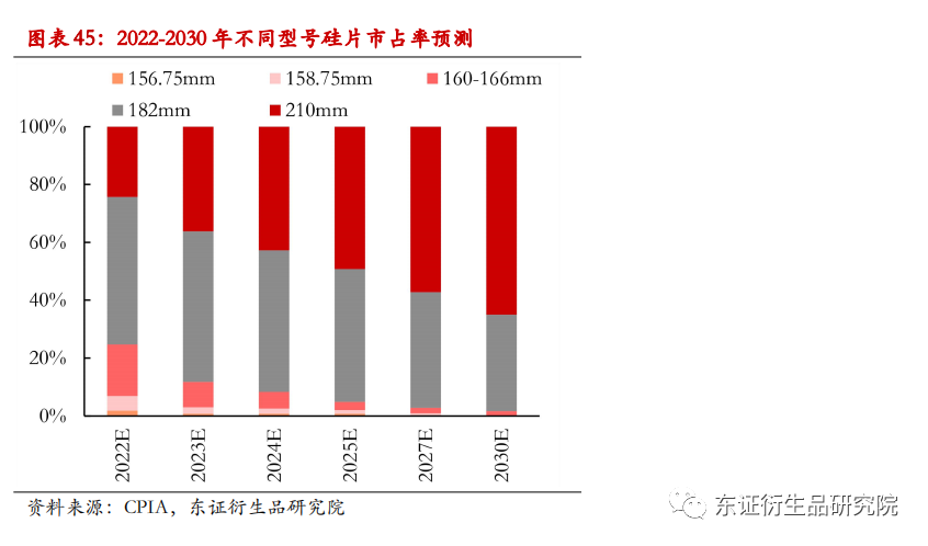 近几年,硅片逐渐向着大尺寸的方向发展,大尺寸化有利于增加单片功率,从而摊薄电池片的非硅成本。但硅片尺寸调整还需考虑上下游匹配和标准化问题,尤其是荷载和大电流问题。目前市场上关于未来硅片尺寸发展方向存在两大阵营,分别是以晶科能源、隆基股份和晶澳股份等为代表的182mm尺寸,以及以中环股份、天合光能、东方日升为代表的210mm尺寸。182mm的提出主要是从垂直产业一体化的角度出发,基于对光伏电池的安装运输、组件的功率和效率、上下游协同性的考虑;而210mm则主要是从生产成本、系统成本的角度出发,210mm硅片在单炉拉棒环节中产量提升15%以上,下游电池生产成本降低约0.02元/W,电站建设总成本降低约0.1元/W。未来几年,预计166mm以下尺寸的硅片将被逐渐淘汰;210mm硅片的上下游匹配问题将会逐步得到有效解决,成本成为影响企业投资生产更重要的因素,因此210mm硅片市占率将稳步上升;182mm硅片凭借其在垂直一体化生产的优势,将成为市场中主流的尺寸,但随着210mm硅片应用技术的突破发展,182mm将会为其让步。此外,更大尺寸的硅片在未来几年也难以在市场中得到广泛应用,这是因为大尺寸硅片的人工成本与安装风险将大大增加,很难被生产成本、系统成本的节省而抵消。2021 年,市场上硅片尺寸包括 156.75mm、157mm、158.75mm、166mm、182mm、210mm 等。其中,158.75mm 和 166mm 尺寸占比合计达到 50%,156.75mm 尺寸占比下降为 5%,未来将被逐渐替代;166mm 是现有电池产线可升级的最大尺寸方案,将是近 2 年的过渡尺寸,预计2030年市占率不足2%;2021 年 182mm 和 210mm 尺寸合计占比达 45%,未来市占率将快速提高,预计2030年合计市占率可超98%。