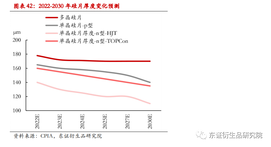 除了寿命长、转换效率高以外,单晶硅片还具有薄片化的优点,有利于降低硅耗和硅片成本,但需注意碎片率的上升。硅片薄片化有助于降低制造成本,且当前的切片工艺完全能满足薄片化的需要,但硅片厚度还要满足下游电池片、组件制造端的需求。总的来说,近年来硅片厚度不断减小,多晶硅片厚度明显大于单晶硅片,其中单晶硅片进一步分为n型硅片与p型硅片,而n型硅片主要包括TOPCon 电池用途和HJT电池用途。2021年,多晶硅片平均厚度为 178μm,未来缺乏需求驱使其继续变薄,因此预测 2022-2024年其厚度小幅下降,2025 年之后厚度维持在 170μm左右 ;p型单晶硅片平均厚度在约为170μm,预计2025年、2030年下降至155μm、140μm。n型单晶硅片中,用于HJT电池的硅片厚度约 150μm,用于 TOPCon 电池的 n 型硅片平均厚度为 165μm ,预测2025年、2030年的厚度将分别达到155μm和140μm、145μm和135μm。
