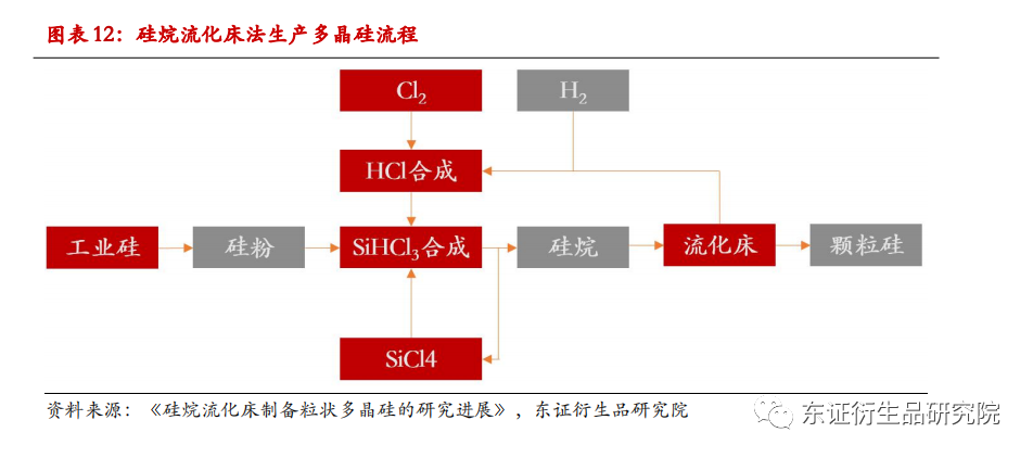 多晶硅的生产流程大体分为两步,第一步先将工业硅粉与无水氯化氢反应得到三氯氢硅和氢气,经反复蒸馏提纯后分别得到气态三氯氢硅、二氯二氢硅以及硅烷;第二步是将上述高纯气体还原成晶体硅,而还原步骤在改良西门子法和硅烷流化床法中有所不同。