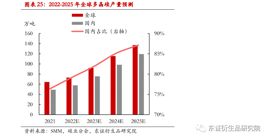 基于对2022-2025年我国及海外多晶硅产量的分别预测,可以加总得到全球多晶硅产量预测值,预计2025年全球多晶硅产量可达137.1万吨。根据产量的预测值,可以大致得出国内多晶硅产量的全球占比,预计2022-2025年国内多晶硅份额逐渐扩大,2025年可超87%。