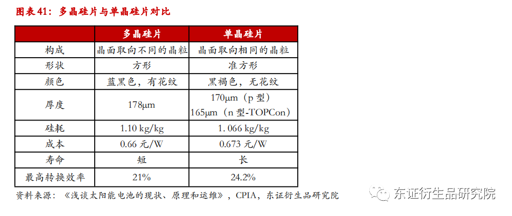 目前硅片主要分为多晶硅片及单晶硅片两种类型,单晶硅片具有使用寿命长、光电转换效率高的优势。多晶硅片由晶面取向不同的晶粒构成,单晶硅片则是以多晶硅为原材料制成的、晶面取向一致的晶粒集合体。外观上,多晶硅片、单晶硅片呈蓝黑色和黑褐色,由于两者分别由多晶硅锭和单晶硅棒切割加工而来,因此形状分别为方形及准方形。多晶硅片和单晶硅片的使用寿命均在20年左右,若封装方式及使用环境较为适宜,使用寿命可达25年以上,总的来说单晶硅片的寿命略长于多晶硅片。此外,单晶硅片在光电转换效率上也略胜一筹,其位错密度和金属杂质比多晶硅片小得多,各种因素综合作用使得单晶的少子寿命比多晶高出数十倍,从而表现出转换效率优势。2021年,多晶硅片的最高转换效率在21%左右,单晶硅片最高可达24.2%。