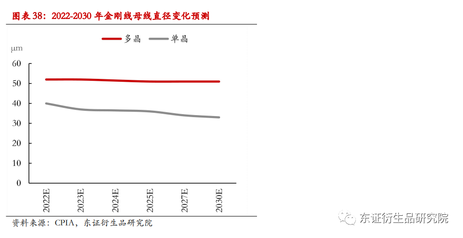 单晶硅片生产工艺分为拉晶、切方、切片、清洗分选四个环节,金刚线切片法的出现大幅降低了切片损耗率。拉晶环节在上文有所介绍,切方包括截断、开方、磨面倒角操作,切片则是使用切片机将柱状硅单质切为硅片,清洗分选是硅片生产的最终环节。金刚线切片法较传统的砂浆线切片优势明显,主要体现在耗时短、损耗低。金刚线速度是传统切割的五倍,比如针对单片硅片切割,传统砂浆线切割需耗时约10小时,金刚线切割仅需2小时左右。金刚线切割损耗也比较少,金刚线切割造成的损伤层小于砂浆线切割,有利于切割更薄的硅片。近年来,为了降低切削损耗和生产成本,企业纷纷转而使用金刚线切片法,且金刚线母线直径越来越低。2021 年,金刚线母线直径为 43-56μm,用于单晶硅片的金刚线母线直径降幅较大,且呈不断下降趋势。预计2025、2030年,用于切割单晶硅片的金刚线母线直径分别为36μm、33μm,用于切割多晶硅片的金刚线母线直径分别为51μm、51μm。这是由于多晶硅片中缺陷及杂质较多,细线容易发生断线,因此用于多晶硅片切割的金刚线母线直径大于单晶硅片,且随着多晶硅片市占率逐渐降低,用于多晶硅片切割的金刚线母线直径降幅趋缓。