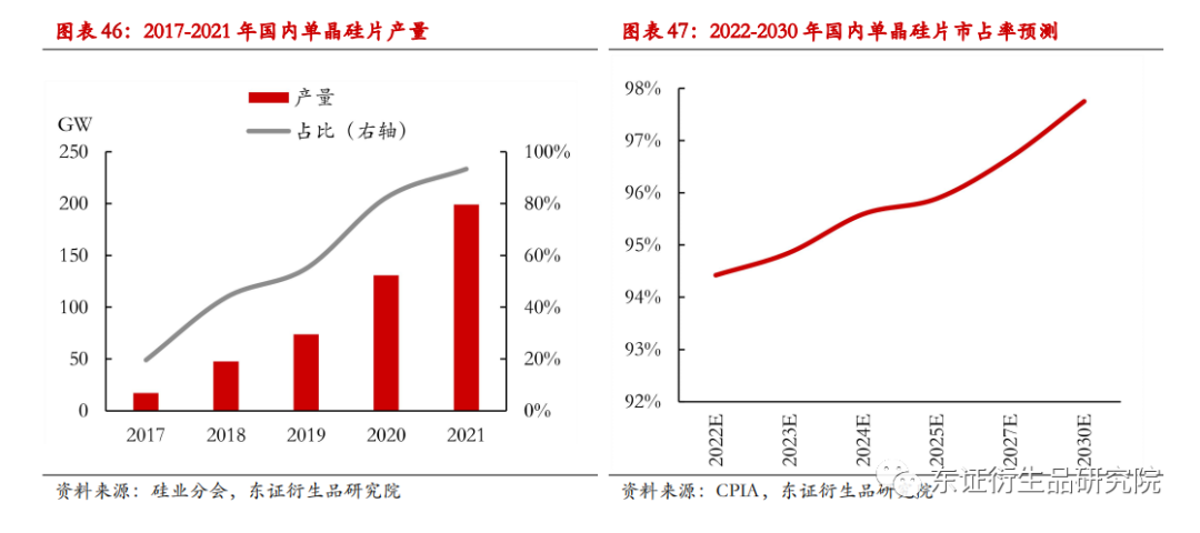 近年来单晶硅市场份额持续提升,已占据市场主流位置。2012-2021年单晶硅占比从不足20%上涨至93.3%,涨幅明显。2018 年及市场上的硅片主要以多晶硅片为主,占比达50%以上,主要原因是单晶硅片的技术优势不能覆盖成本劣势。2019年至今,随着单晶硅片的光电转换效率明显超过多晶硅片,且单晶硅片生产成本随着技术进步而不断下降,单晶硅片市场份额占比不断提高,成为市场中的主流产品。预计2025年单晶硅片占比将达到96%左右, 2030 年单晶硅片市占率可达 97.7%。